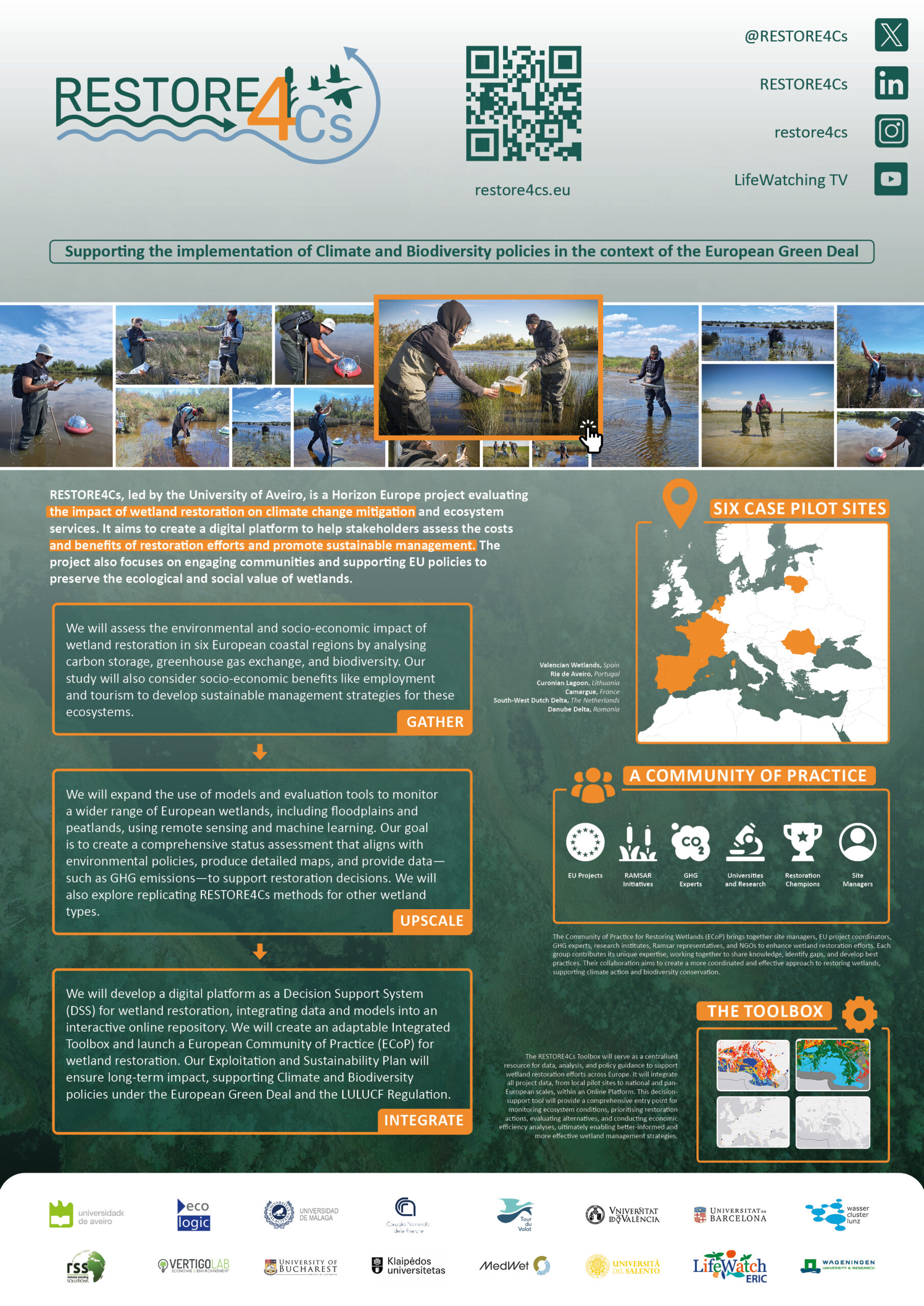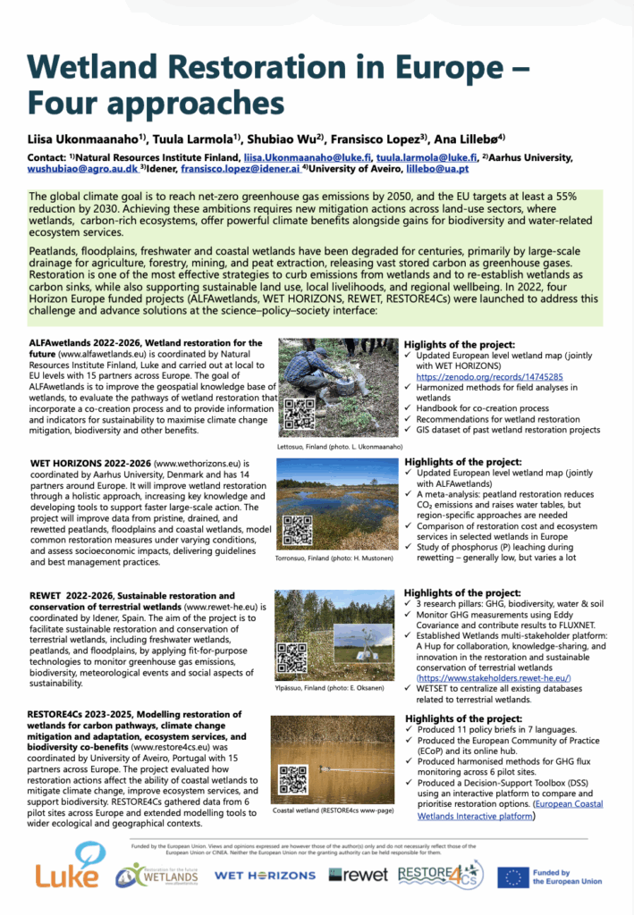 Want to know more about the project activities and how each partner contributes to RESTORE4Cs? Download the interactive e-poster to learn more about how we plan to assess the impact of restoration on the ability of wetlands to mitigate climate change.