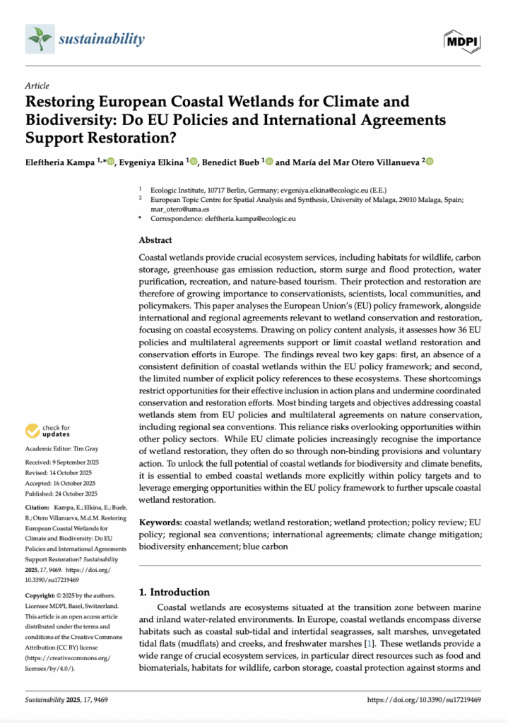 Kampa, E., Elkina, E., Bueb, B., & Otero Villanueva, M. d. M. (2025). Restoring European Coastal Wetlands for Climate and Biodiversity: Do EU Policies and International Agreements Support Restoration? Sustainability, 17(21), 9469.