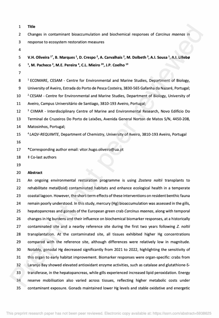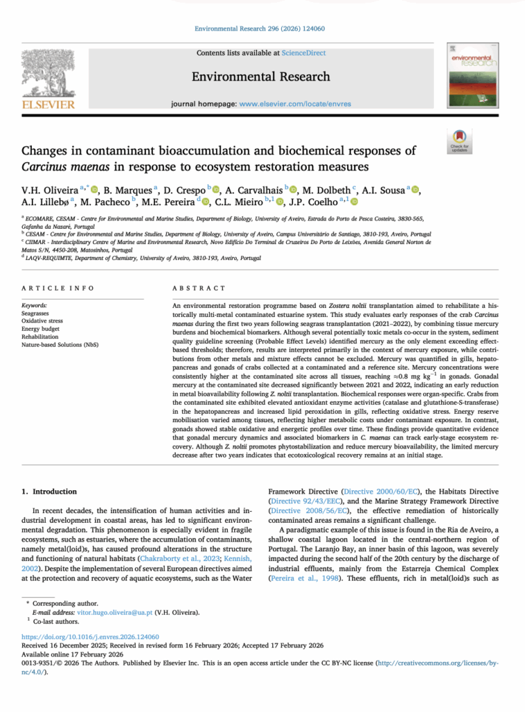 Oliveira, V. H., Marques, B., Carvalhais, A., Crespo, D., Dolbeth, M., Sousa, A. I., Lillebø, A. I., Pacheco, M., Pereira, M. E., Díez, S., Coelho, J. P., & Mieiro, C. L. 2025. Environmental Research, 275(March). https://doi.org/10.1016/j.envres.2025.121429